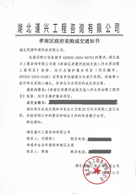 【喜讯】5月14日,公司成功中标《孝南区府河流域支流入河水质治理工程项目》检修、运行及维护服务项目