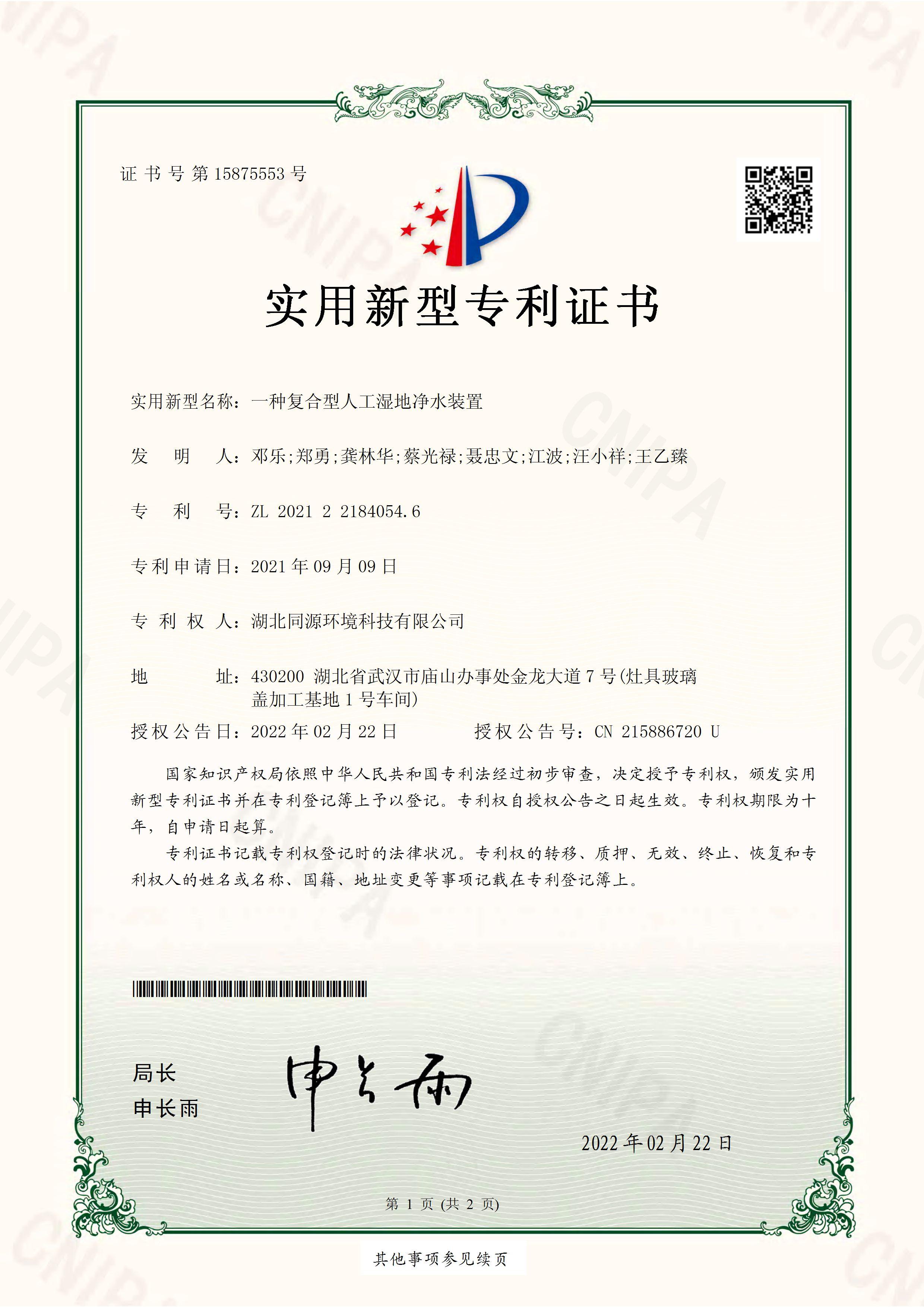 实用新型专利:一种复合型人工湿地净水装置