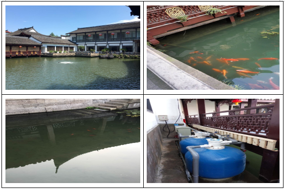 绍兴饭店位于市中心,背靠以越王勾践卧薪尝胆而得名的卧龙山,毗邻城市广场,环境幽雅,白墙黑瓦、小桥流水,具有浓郁的江南民居特色。绍兴饭店内有景观湖,湖水域面积1000m2,湖内水总量约3000m3。 采用景观水循环净化成套设备(“高速砂缸过滤装置+紫外线杀菌器”工艺)及补种景观植物(睡莲),对该景观水进行循环净化处理,以达到除藻、灭菌、增氧等目的,保证景观水水质优良。
